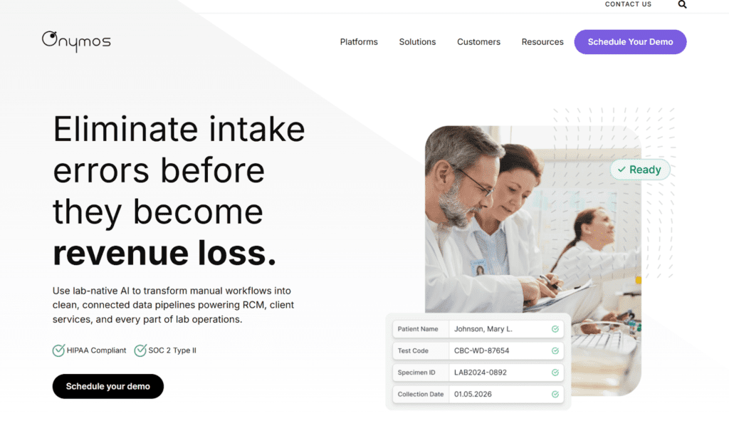 | Onymos DocKnow | Clinical & diagnostic labs; document-driven lab automation from intake through billing | SmartSync AI reconciliation + No-Data Architecture |
